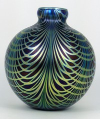 49 - CHARLES LOTTON IRIDESCENT ART GLASS VASE Charles Lotton iridescent studio art glass vase of bulbous form with pulled loop design. Signed to underside and dated 1981. Measures 6" (15.2cm) height x 5 1/2" (14cm) diameter.