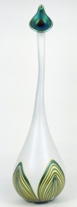 50 - CHARLES LOTTON ART GLASS WATER SPRINKER VASE Charles Lotton studio art glass Persian Water Sprinkler vase. White body with iridescent pulled feather accents around base and iridescent accent to inside rim. Signed to underside and dated 1981. Measures 15 1/2" (39.3cm) height.