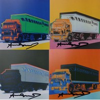 5 - ANDY WARHOL 'TRUCKS' SIGNED INVITATION SET Andy Warhol (American, 1928-1987); Trucks, 1985, complete set of four announcement cards in original printed folder. Color offset lithographs, each card hand signed in black marker along lower edge. Each measures 6 3/4" (17.2cm) x 6 3/4" (17.2cm).