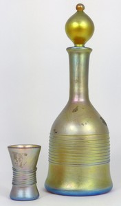 6 - 2pc LUNDBERG STUDIOS GLASS DECANTER & CORDIAL 2 pieces of Lundberg Studios gold aurene art glass with threaded decoration. Each signed, dated 1982 and numbered to underside. Decanter measures 10 1/4" (26cm) height.