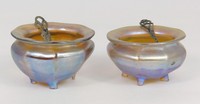 9 - PR TIFFANY GOLD FAVRILLE GLASS FOOTED SALT CELLARS Pair of Tiffany Favrile glass footed salt cellars. Each marked L.C.T. to underside. Each salt measures 2 1/4" (5.7cm) diameter. Includes two sterling silver spoons, each marked and measures 2 1/4".