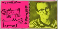 10 - KEITH HARING MARKER DRAWING ON CATALOG Keith Haring (American, 1958-1990) marker drawing to inside front cover of Tony Shafrazi Gallery exhibition catalog. Dedicated to Shelly. Depicts two dogs. Signed and dated 1982. Catalog measures 9 3/4" x 9".
