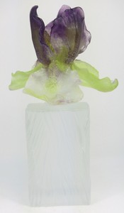 13 - DAUM PATE DE VERRE PURPLE IRIS PERFUME BOTTLE Daum France frosted crystal perfume bottle with Pate de Verre glass stopper in the form of an iris. Signed to underside. Measures 7 7/8" height.