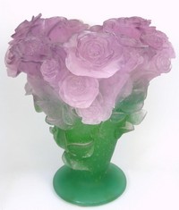 14 - DAUM PATE DE VERRE 'ROSES' VASE LARGE Large Daum Pate de Verre glass Rose vase. Signed Daum France to side of base. Measures 12" height x 11" width.