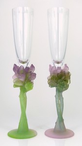 15 - 2pc DAUM PATE DE VERRE ROSE CHAMPAGNE FLUTES 2 Daum Pate de Verre crystal champagne flutes with Rose pattern. Each having a crystal flute top and a violet and green tone Pate de Verre handle and base. Each signed Daum France to underside and measures 11 3/4" height.