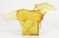 19 - LALIQUE AMBER CRYSTAL 'KAZAK' HORSE Lalique frosted amber crystal horse figurine. Titled 'Kazak'. Signed Lalique France and holds original label. Measures 7" length.