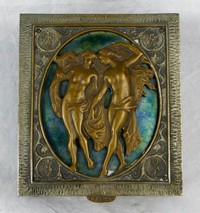 1 - OSCAR BACH SILVERED BRONZE DRESSER BOX Oscar Bruno Bach (American, 1884-1957) silvered bronze jewelry box with enameled metal insert depicting two nude figures to lid. Signed to underside. Measures 5" x 4 1/2" x 2 3/4" height.