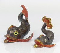 22 - 2pc HEREND PORCELAIN DOLPHIN FIGURINES Two Herend porcelain dolphin figures. Each marked to underside. Largest measures 3" height and length.