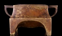 29 - CHINESE BRONZE HANDLED CENSER OF RECTANGULAR FORM Chinese bronze twin handled censer of shaped rectangular form raised on four block feet. Marked to underside. Measures 5 1/2" width x 2 3/4" height.