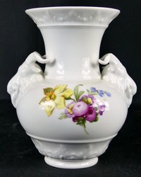 30 - KPM PORCELAIN VASE w RAMS HEAD HANDLES KPM porcelain vase decorated with hand painted floral sprays. Having two handles in the form of ram's heads. Marked to underside. Measures 6 3/4" height x 5 3/4" width.
