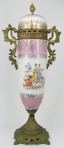 31 - FRENCH SEVRES STYLE ORMOLU MOUNTED PORCELAIN URN French porcelain covered urn with ormolu mounts and base. Body depicts two different scenes with beauties and cherubs with gold gilt decoration over a pink ground. Measures 17" height.