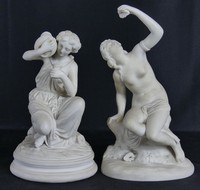 33 - 2pc PARIAN BISQUE PORCELAIN SEATED NUDE FIGURINES Two Parian bisque porcelain draped, partially nude figures. Nude with shell impressed Copeland to base and measures 9 3/4" height.