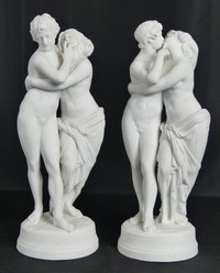 34 - PR PARIAN BISQUE PORCELAIN NUDE LOVERS FIGURINES Pair of Parian bisque porcelain figures depicting two nude lovers embracing in similar poses. Each marked 845 to underside and measures 12" height.