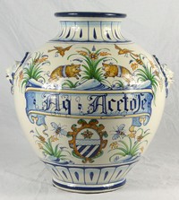 35 - ITALIAN MAJOLICA HANDLED CERAMIC VASE Italian Majolica pottery vase with mask handles. Marked to underside. Measures 14" height x 12 1/2" width.