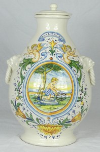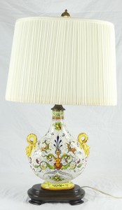 37 - ITALIAN MAJOLICA HANDLED CERAMIC LAMP Italian Majolica pottery lamp with rams head handles. Ceramic measures 10" height x 8 1/2" width. Lamp measures 24" overall height.