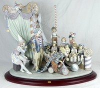 38 - LLADRO 'CIRCUS TIME' PORCELAIN FIGURINE Lladro porcelain group figure titled 'Circus Time' #1758. Depicts a circus scene with three clowns and nine children. Marked, signed and numbered 56 to underside. Includes wooden stand. Measures 29" length x 24" height.