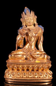 42 - CHINESE TIBETAN GOLD GILT BRONZE BUDDHA Chinese or Tibetan gold gilt bronze Buddha seated on a double lotus blossom base. Blue and red painted accents. Holds calligraphy to top of base. Marked to underside of base. Measures 6 3/4" height x 4" width.