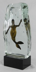 43 - ALFREDO ROSSI MURANO GLASS BLOCK w MERMAID Alfredo Rossi Murano art glass sculpture in the form of a colorless block with submerged figure of a mermaid on a black base. Signed to front of base. Measures 17" height.