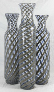 49 - 3pc MURANO ART GLASS VASES w SPIRALED DECORATION Set of 3 Murano Italian art glass vases each having a blue and grey spiral decoration. Each holds original label to underside. Tallest measures 18" height.