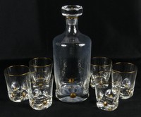 50 - 7pc ITALIAN GLASS DECANTER w SIX TUMBLERS Italian glass decanter and six tumblers. Each piece having a gilt rim and four gilt dimples. Decanter measures 10" height. Tumblers measure 3 3/8" height.