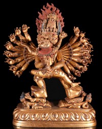 6 - CHINESE TIBETAN GILT BRONZE FIGURE OF YAMANTAKA Chinese or Tibetan gilt bronze Buddha deity figure of Yamantaka standing in alidhasana with his consort, standing on top of prostrate figures, birds and bovine animals above a lotus base, with his many arms radiating about him and holding various attributes. Marked to underside. Measures 14 1/2" height x 9 1/2" width.