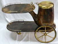 10 - ALDO TURA BRASS & LACQUER GOATSKIN BAR CART Aldo Tura Italian drink serving cart in the form of a smoking pipe. Lacquered in brown goatskin with brass mounts. Having a large integrated ice bucket to serve as a champagne or wine cooler. Measures 40" length x 18" width x 27 1/2" height.
