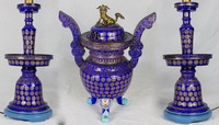 11 - 3pc CHINESE CLOISONNE URN & CANDLE HOLDERS 19th century Chinese cloisonne covered urn and pair of candlestick holders mounted as lamps. Each having gold Taoist symbols with floral and geometric decoration over a cobalt blue ground. Tripod censer having polychromed beast feet, twin handles and foo lion finial. Urn measures 16" height x 13" width. Cloisonne candlesticks measure 14 3/4" height. Lamps measure 27" overall with base and mount.