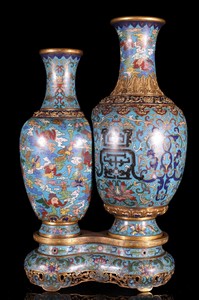 12 - CHINESE CLOISONNE DOUBLE VASE Chinese cloisonne double vase. Decorated with lotus blossoms, stylized vines and clouds over a blue ground. Vase measures 10" height x 8" width. Stand measures 7" width x 2 3/8" height.