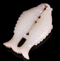 13 - CHINESE WHITE & RUSSET JADE TWIN FISH Chinese carved white and russet jade twin fish pendant. Measures 2 3/8" length x 1" height.