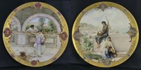 22 - PR JEAN POUYAT LIMOGES HAND PAINTED CHARGERS Pair of Jean Pouyat Limogoes hand painted trays. One depicts a courting couple and the other two female musicians, each with similar foliate border. Each marked J.P.L. France to underside and measures 15 3/4" diameter.