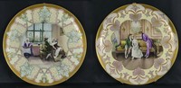 23 - PR LIMOGES HAND PAINTED PORCELAIN CHARGERS Pair of Tressemann & Vogt Limoges porcelain platters. Each decorated with seated figures in interior scenes. Each marked T&V France and measures 15 3/4" diameter.