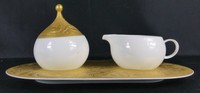 24 - 3pc ROSENTHAL 'MAGIC FLUTE' PORCELAIN SET 3 pieces of Rosenthal porcelain in the Magic Flute Gold pattern. Includes creamer, covered sugar and tray. Designed by Bjorn Winblad. Each piece marked to underside. Tray measures 12 1/4" length.