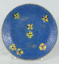 25 - CHINESE BLUE GLAZED DISH w MEDALLIONS Chinese blue glazed dish with incised decoration and colorful medallions. Bamboo leaf decoration to underside. Signed to underside. Measures 7 3/4" diameter.
