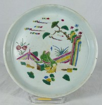 28 - CHINESE DOUCAI PORCELAIN TRAY Chinese Doucai porcelain tray or low bowl depicting a seated figure in a courtyard. Measures 9 5/8" diameter.