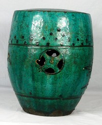 29 - CHINESE ANTIQUE GREEN GLAZED GARDEN SEAT Antique Chinese green glazed garden seat of drum form having floral decoration and pierced medallions. Measures 16" height x 12" diameter.