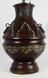 30 - CHINESE ENAMELED BRONZE LAMP Chinese champleve enamel lamp with double ring handles. Vase measures 14" height. Lamp measures 25 1/4" overall height.
