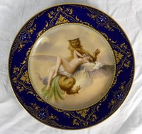 31 - ROYAL VIENNA 'DER SCHLAF' PORCELAIN PLATE Royal Vienna hand painted porcelain plate depicting a nude maiden reclining on the back of a griffin. Signed Jager pinx lower right. Marked to underside and titled 'Der Schlaf'. Measures 8" diameter.