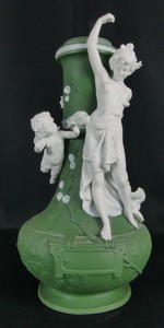 32 - VOLKSTEDT JASPERWARE CHERUB VASE Volkstedt jasperware porcelain vase with partially nude female and cherub in high relief. Marked to underside and numbered 8313. Measures 11 1/2" height.