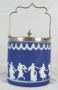 33 - ADAMS ENGLISH JASPERWARE BISCUIT BARREL Adams cobalt jasperware biscuit barrel or ice bucket with silver plated mount. Marked to underside. Measures 5 1/4" diameter x 6 1/4" height, excluding handle.