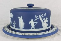 34 - WEDGWOOD JASPERWARE CHEESE DOME Wedgwood cobalt blue jasperware covered cheese dish. Marked to underside. Measures 9 1/2" diameter x 4 1/2" height.