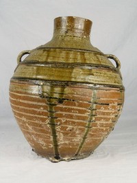 35 - CHINESE GLAZED STONEWARE JUG Chinese partially glazed stoneware vessel having two mask-form ring handles. Measures 12 1/2" height x 10" diameter.