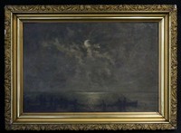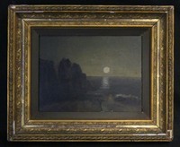 42 - AMERICAN SCHOOL MOONSCAPE OIL ON BOARD 19th century American school oil painting on panel depicting the moon reflecting into the seat. Measures 11 1/2" x 8 1/2" + 3 1/4" frame.