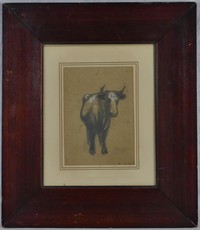 43 - EDGAR J TAYLOR 'BULL' PENCIL DRAWING ON PAPER Pencil drawing on paper depicting a bull attributed to Edgar J Taylor (American, b. 1862). Measures 7" x 5" + 4 1/2" mat & frame.