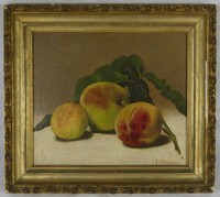 44 - P. A. DANIELS 'STILL LIFE' OIL PAINTING ON CANVAS P Augusta Daniels (American, 19th century) oil painting on canvas depicting a still life with fruit. Signed lower right. Measures 8 3/4" x 7 1/2' + 1 1/2" frame.
