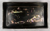 47 - CHINESE ABALONE INLAID TRAY w STAND Chinese black lacquered tray with stand decorated with inlaid abalone depicting figures and pagodas. Signed upper right. Measures 12 1/4" x 7 1/4",