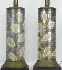 49 - PR ART DECO GLASS LAMPS OF CYLINDRICAL FORM Pair of Art Deco glass lamps with threaded design surrounding foliate decoration. Metal hardware and white glass shades. Glass measures 13 3/4" height. Lamps measures 31" overall height.