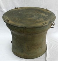 4 - SOUTHEAST ASIAN BRONZE RAIN DRUM Southeast Asian bronze frog kha rain drum. Circular top features star at the center with radiating decorative bands and four frog form finials. Body is flanked by strap handles and has bands of decoration throughout. Measures 25 3/4" diameter x 19 1/4" height.