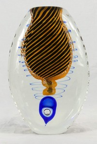 51 - MURANO ART GLASS VASE TEXTURED w SWIRL DESIGN Murano art glass vase colorless with spiral blue, orange and black internal decoration. Textured sides. Measures 9" height.