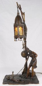 6 - ANTON CHOTKA VIENNA BRONZE 'LION TAMER' LAMP Anton Chotka (Austrian, 1881-1955) bronze lamp depicting a female lion tamer standing on a Persian carpet beneath a street lamp. Signed Chotka. Measures 17 1/2" height.