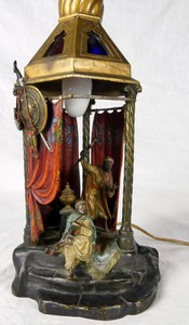 7 - FRANZ BERGMAN VIENNA BRONZE TENT LAMP Franz Bergmann (Austrian, 1861-1936) cold-painted polychrome bronze lamp depicting two Arabs in a tent. Holds Bergman B urn and marked Austria. Measures 10" height.